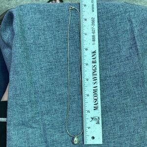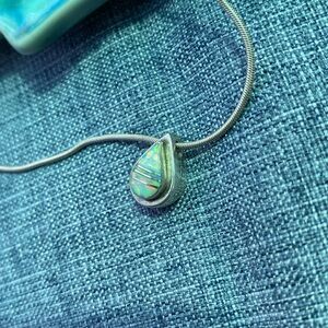 Sterling Silver Necklace and Opal Teardrop Pendant. I bought this new a long time ago for myself and was told that the stone was real Opal/ Opals but I never had it appraised so I can’t guarantee if it’s real or not. This has age, has been worn a bunch and shows all over wear to the necklace and the pendant. This has imperfections including scratches, scrapes, dents, bends/kinks, discolorations and it may have other imperfections but it is still a very pretty necklace. Measurements are rough approximate measurements and colors may be off because of lighting.