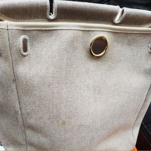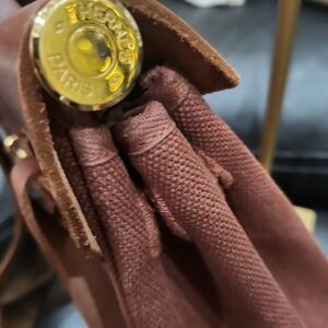 Gorgeous Hermes Herbag 2 bags backpack in brown with the second interchangeable bag in ivory beige. Backpack straps can be removed allowing for use of the leather handle and convert to a beautiful handbag with leather handles. Pre-loved pre-owned in good condition, corners intact with no rubbing, no holes, some scratches on leather by handles. There is a small spot on the beige bag, not noticeable, very small. Leather handles are in very good condition., intact with no wearing. Authenticity guaranteed. Comes with original garment bag, second canvas larger bag in beige, and leather clochette. Dimensions: brown bag, 11" W x 10"L.