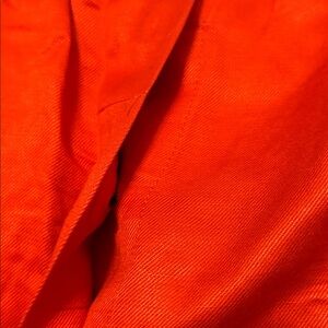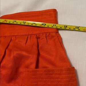 Classic A-line silhouette in bright tangerine fabric. Navy waistband detail adds sophisticated contrast. Premium linen blend construction. This is used has some wear overall good shape very cute skirt