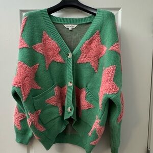 Stylish oversized green cardigan with pink star patterns. Features button closure. Perfect for layering. Worn Once!