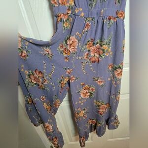Beautiful and breezy American Eagle floral jumpsuit in a soft periwinkle blue with peach and gold flower print. Features adjustable spaghetti straps, a stretchy waistband for a flattering fit, and wide ruffled leg hems that give it a flowy, feminine silhouette. Lightweight woven fabric makes it perfect for spring and summer wear.
