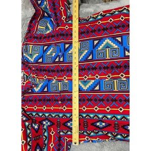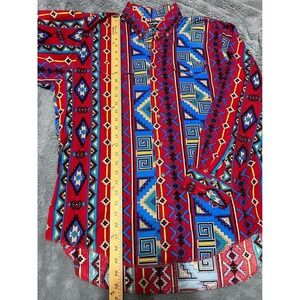 Keywords: Wrangler western shirt, Cowboy Cut, geometric print, red blue shirt, long sleeve western, mens western wear, rodeo shirt, Americana style, southwestern print, button up shirt, casual western, XL tall, single needle tailoring