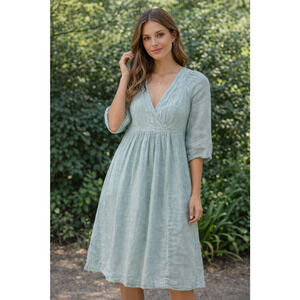 Beautiful Sundance women’s dress made from 100% linen with a 100% cotton lining. This lightweight, breathable dress features a flattering wrap-style V-neck, empire waist, and relaxed boho silhouette. Perfect for summer, casual outings, or beach vacations.