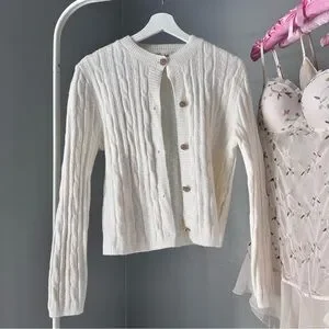 Stay cozy and stylish with this elegant white cable knit cardigan sweater. Has beautiful rose gold buttons. In excellent condition. This is a size large. Offers are welcome.