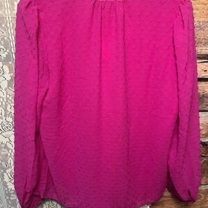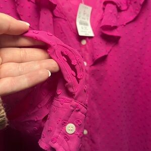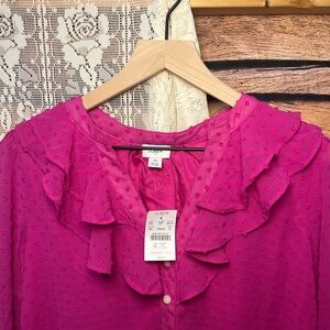 J. Crew NWT pink textured chiffon ruffle button-up blouse. It features a vibrant fuchsia/magenta color, long sleeves, and ruffled accents along the V-neckline and button placket. The fabric has a subtle, raised "clip-dot" or "Swiss dot" texture and is made of sheer polyester, with a camisole lining for coverage. Women’s size medium. Bust 20” Shoulder to waist 23”. Will ship by next day unless it’s a holiday, a Sunday, or I’m on vacay. Make me an offer to make it yours :)