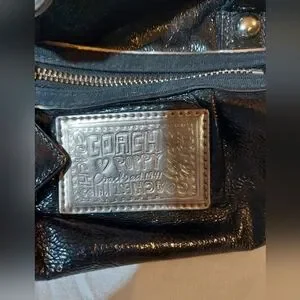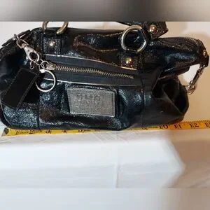 Coach Poppy Black Patent Leather Satchel With Silver Hardware And Teal Lining