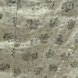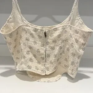 This is a beautiful cream crop top with a delicate blue/gray floral print. It features a flattering corset-style bodice, a straight neckline, and thin cami straps. There is a zipper closure in the back for easy wear. Perfect for a summery, cottagecore look.