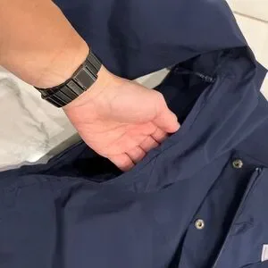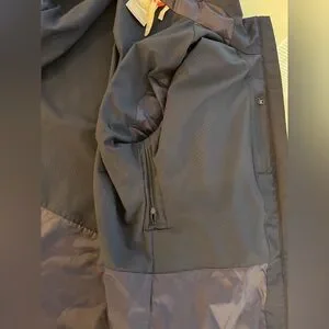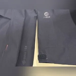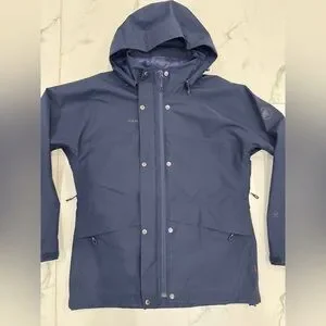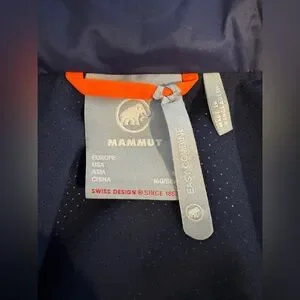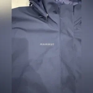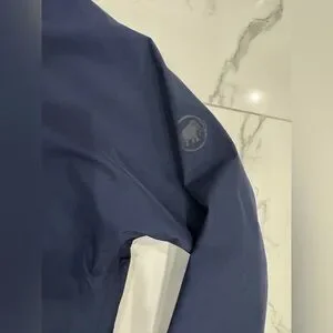 Stylish navy jacket by Mammut. Features a hood and zippered pockets. Ideal for outdoor activities.