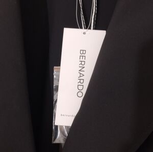 Chic black trench coat by Bernardo. Timeless design with a single button closure. Perfect for versatile styling.