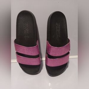 Stylish holographic slippers. Features bold pink straps. Comfortable black sole. Perfect for casual wear.