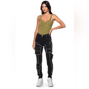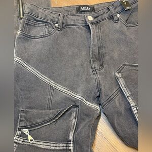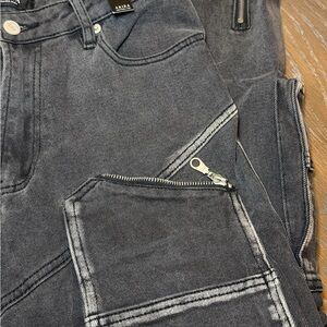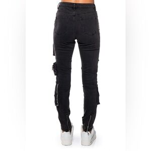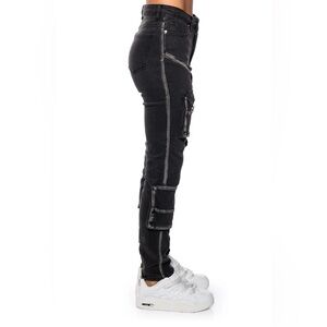 Stylish Dark grey Skinny cargo jeans for women, perfect for a trendy look. Features multiple pockets for convenience. Made from structured cotton blend fabric and feature acid wash trim. High rise.