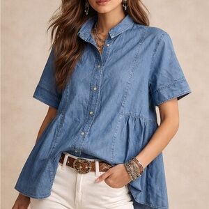 Stylish blue denim button down shirt. Features short sleeves and a relaxed fit. Ideal for versatile wear.