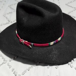 Stylish black wide brim hat featuring a vibrant multicolor band. Perfect for adding a pop of color to any outfit.