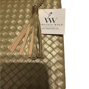 Add a touch of luxury to your ensemble with the Virginia Wolf Gold Textured Clutch. This elegant piece features a sophisticated woven design and a chic tassel accent, perfect for any occasion.
