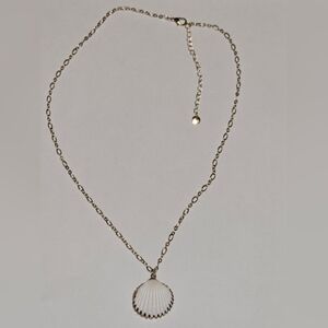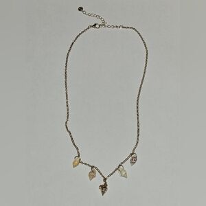 Zara layered gold-tone necklace with a coastal, beach-inspired design. It features two delicate chains: one finer chain and one slightly chunkier link chain, creating an effortless layered look. The necklace is adorned with mixed shell charms, including small natural seashells and a larger scallop shell pendant as the focal point.