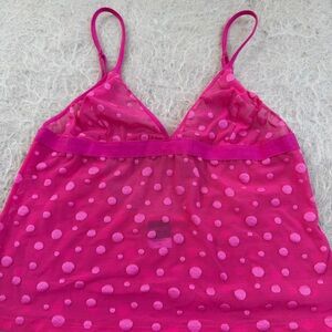 Such a cute early-2000s Victoria’s Secret moment — this sheer mesh cami and matching bikini bottoms are done in a vibrant hot-pink with raised polka-dot detailing that feels so classically Y2K. The cami has a soft, lightweight drape with thin straps and a stretchy underbust band, and the panties match perfectly for that nostalgic VS look. A rare Body by Victoria find, especially in a full set.