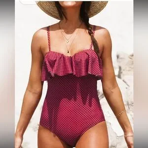 Chic one-piece swimsuit with ruffle detail. Adjustable straps for comfort.