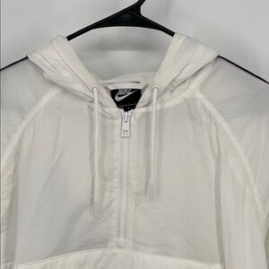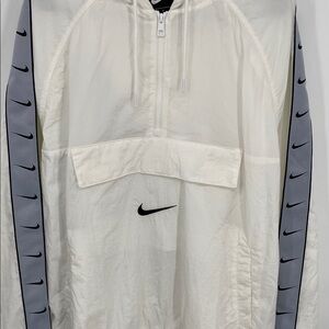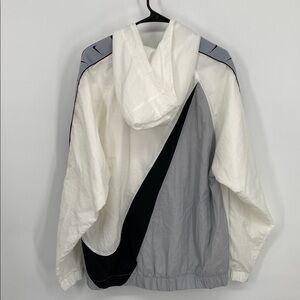Nike windbreaker with a white body and gray sleeve accents. Features a front pocket and hood. Ideal for casual wear.