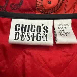 Chico's 100% silk jacket in vibrant red with intricate patterns. Features black trim and button closure. Stylish and bold. Chico’s size 3 is standard XL.