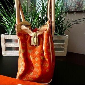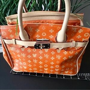 Add a touch of magic to your collection with this Disney Magic Kingdom Birkin-inspired satchel. Featuring an allover Disney icon print on a vibrant orange canvas with tan faux leather trim, this structured bag blends theme-park charm with high-end style inspiration.
