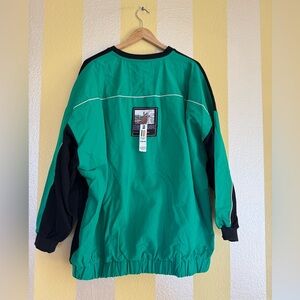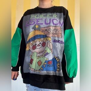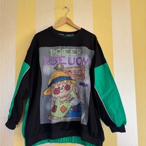 This playful sweatshirt features a vibrant graphic design with green and black accents. Adds a unique + elevated touch to any outfit.