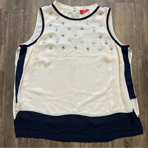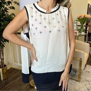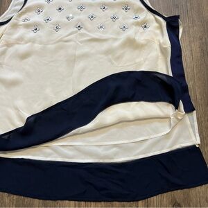 Gorgeous and elegant Rena Lange Fashion show (red tag) silk cream navy blue with floral embroidered front sleeveless top blouse. Flowy and confortable top.