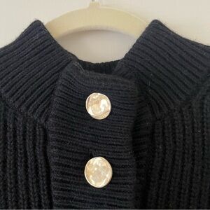 This is a classic and elegant black knit sweater with gold buttons. It has a slightly high neckline closed by a button placket.