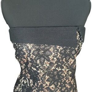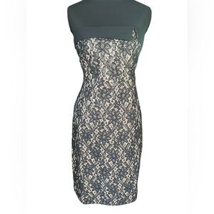 This stunning strapless sheath dress by Talbots features a sophisticated black lace overlay against a gold underlay, perfect for a cocktail night out. The fitted silhouette and timeless design create an elegant and chic look, making it a standout piece for any formal occasion. Dress is new with tags.