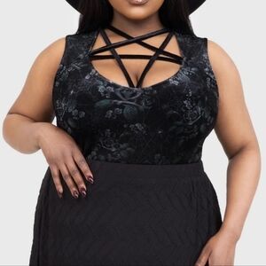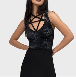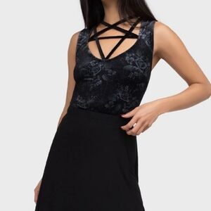 Stylish black tank with green floral pattern. Features unique strappy neckline. Perfect for a bold look.