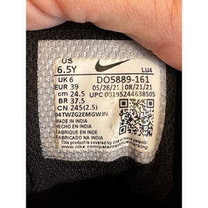Pre-owned Nike Court Borough Mid 2 sneakers in size 6.5Y. The shoes are black and white with red and blue accents. They feature a leather upper, a velcro strap, and a lace-up closure. The shoes have a white midsole and a black outsole. The shoes are in good condition with some minor wear and tear. There are creasing. The shoes are otherwise in good condition and ready to wear. Red swoosh logo on the outside, navy swoosh logo on the inside. Please see pictures for condition
