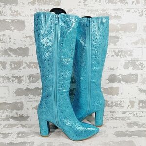 Glistening rhinestones shimmer like a disco ball under dance floor lights in these tall party-perfect boots finished with a covered heel and pointed toe. 3 2/3" heel 15" shaft Full side zip closure Synthetic upper, lining and sole Imported