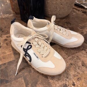 Stylish Sam & Libby sneakers in cream and white. Perfect blend of comfort and fashion. Navy blue accents. Never worn.