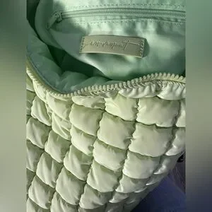Authentic Free People Movement quilted puffer tote in the hard-to-find pale neon green shade. Lightweight but roomy with comfy padded straps — perfect for the gym, errands, travel days, or everyday athleisure fits.
