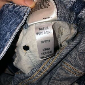 100% cotton. Light fading and distressed detail. Button fly. Foldover waist. 5-pocket design. 16" at the knee narrows to 13" at the leg opening. Made in USA. Revolve Style No. AGOL-WJ218. Manufacturer Style No. A132 983.
