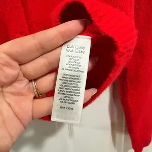 Chic red cardigan with a V-neck design. Features a buttoned front. Perfect for layering.