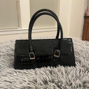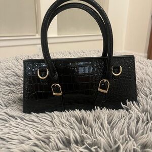 This chic black handbag features a stylish crocodile-embossed design. Perfect for any occasion, it adds a touch of elegance to your outfit.