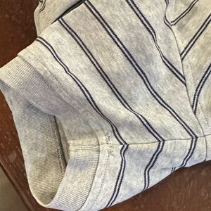 Classic gray polo with navy stripes. Features a comfortable fit. Ideal for casual outings.