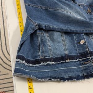 Classic Lane Bryant denim jacket featuring a dark wash with unique distressed hem detailing. This piece has a flattering structured fit with front chest pockets, functional side pockets, and button-front closure. Perfect layered over dresses, tees, or sweaters for year-round wear.