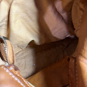 This pre-owned Vera Pelle shoulder bag is crafted from brown leather. It features dual top handles with visible wear and brass-toned hardware, including rings and decorative studs along the top edge. The bag has a main compartment with a fabric lining and multiple interior zippered pockets, one of which is labeled "VERA PELLE MADE IN ITALY." The exterior includes a zippered pocket on the back. The bottom of the bag is reinforced with four metal feet. Does not include long shoulder strap.