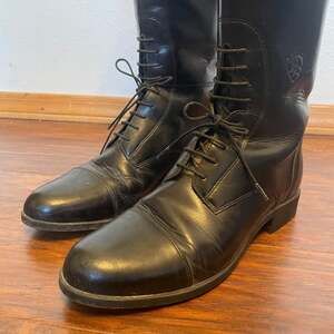 Ariat Tall Lace-Up Black Leather Riding Boots, Women's Size 9 — Style #55101. These classic riding boots feature a high-quality black leather construction with a sleek, tall profile and unique lace-up design.