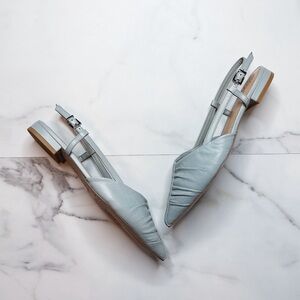 Ruched composition highlights the pointy toe of a slingback flat that's a sophisticated everyday style.