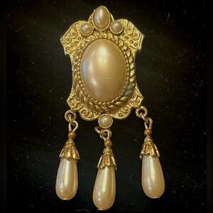This vintage brooch features a stunning combination of gold and pearl, perfect for adding a classic touch to any ensemble.