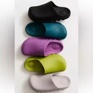 Features: Slip-on style, backless design, clog construction, PVC uppers, round toe, lugged sole