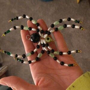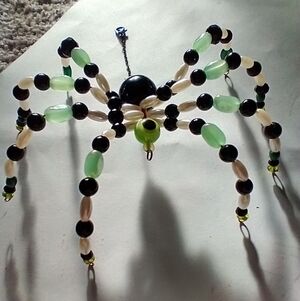 This beautifully unique hand crafted pendant/decor features a striking beaded spider design in black, green, and white. Perfect for adding a bold statement to any occasion.