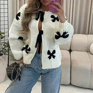Apricot Casual Women's Round Neck Bow Long-Sleeved Knitted Cardigan