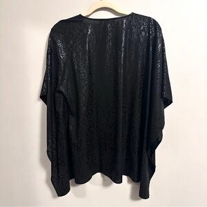 Sophisticated black pullover blouse with a flutter sleeve and a metallic snakeskin print. Loose fit for a graceful silhouette. Ideal for versatile styling.