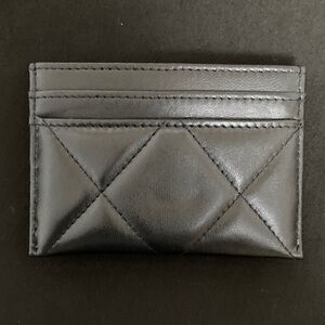 Sleek black card holder with quilted design. Features iconic gold CHANEL emblem. Ideal for chic organization.