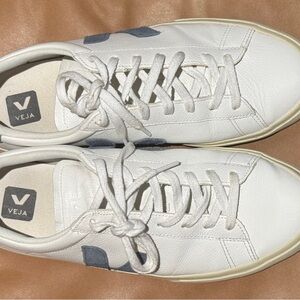 VEJA low-top sneakers crafted in premium white leather with signature blue suede “V” logo. Known for sustainable materials and clean European design, these sneakers are versatile enough for everyday wear while still elevated and modern.
