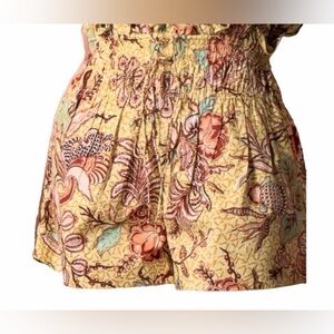 Elevated designer shorts from Ulla Johnson, featuring a stunning Calla Illy floral print in warm yellow with multicolor accents. These floral print mini shorts are crafted with a comfortable smocked elastic waistband and an easy pull-on silhouette—perfect for effortless summer styling.