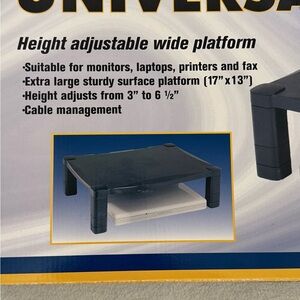 Adjusts in height from 3" to 6-1/2" in 1-1/4" increments and offers a 17" x 13-1/4" sturdy platform. Plastic monitor stand includes cable management. Supports up to 50 lbs. Monitor not included.